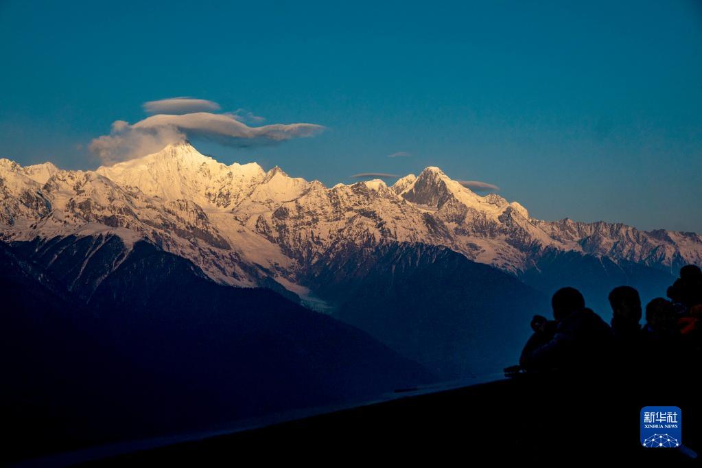 3月10日,游人在觀(guān)賞梅里雪山“日照金山”景觀(guān)。