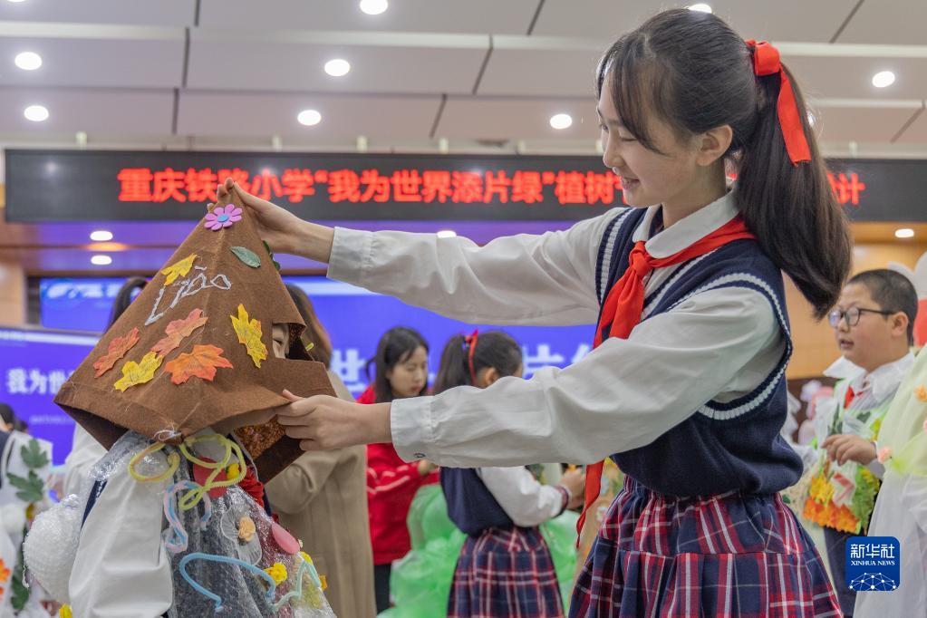 當日,為迎接3月12日“植樹(shù)節”,重慶市九龍坡區鐵路小學(xué)組織師生舉辦“我為世界添片綠”植樹(shù)節環(huán)保系列服裝設計展示活動(dòng)。40余名學(xué)生在學(xué)校老師和美術(shù)義工的指導下,收集身邊各種可以利用的廢棄物,發(fā)揮想象力,制作成環(huán)保服裝,倡導植綠、愛(ài)綠、護綠的生態(tài)理念和綠色生活方式。