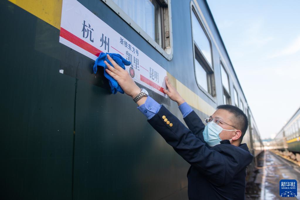 3月10日,杭州客運段的工作人員擦拭Y71次旅游專(zhuān)列的去向牌。