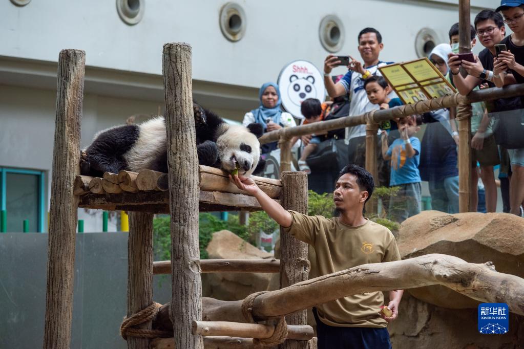 3月11日,在馬來(lái)西亞吉隆坡,飼養員給大熊貓“升誼”喂食。