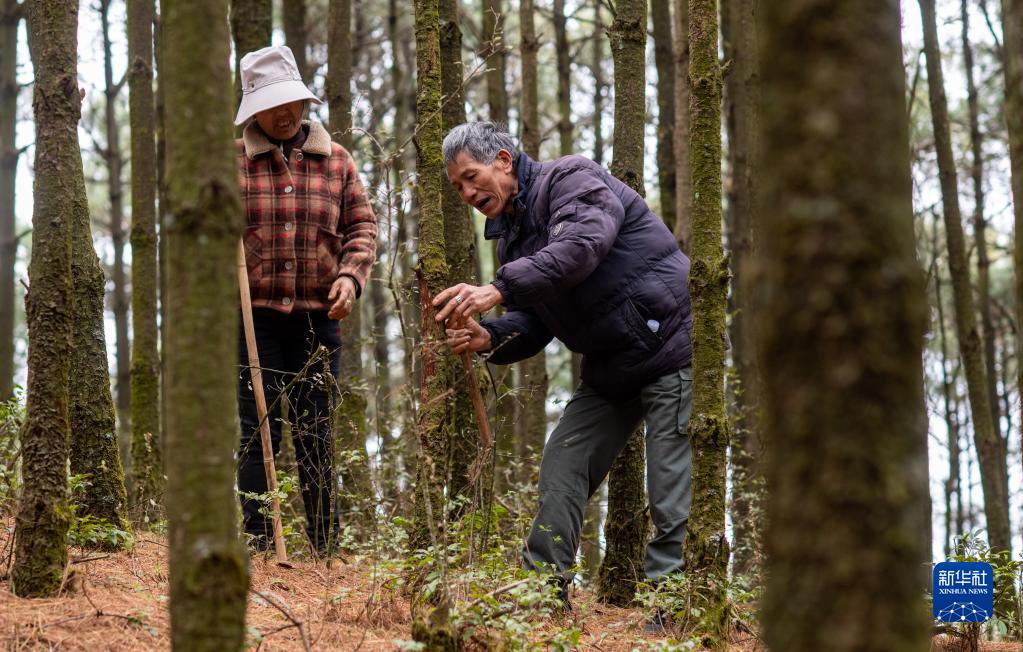 3月12日,護林員王石貴與妻子一起在山林間查看樹(shù)木生長(cháng)情況。