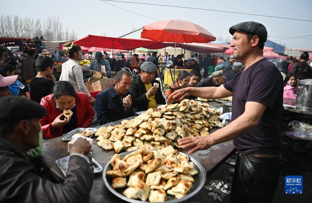 新疆莎車(chē)縣綜合巴扎上,人們在吃新鮮出爐的烤包子(3月12日攝)。