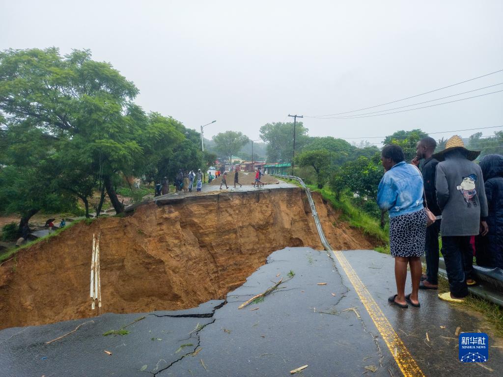 3月14日,在馬拉維南部的布蘭太爾地區,人們查看被洪水沖毀的道路。