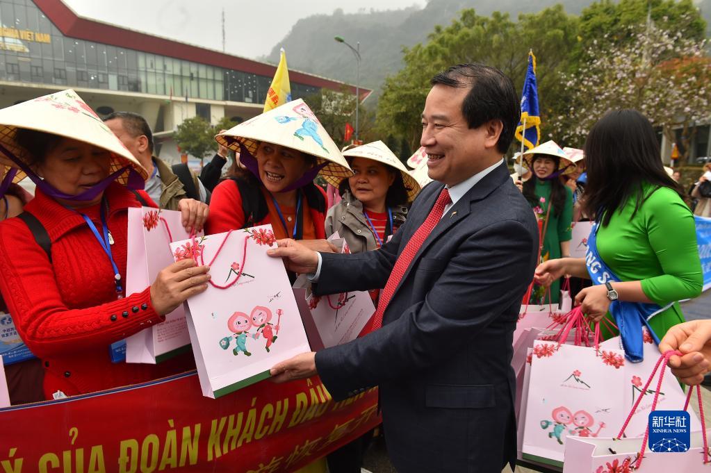 3月15日,在越南諒山省的友誼國際口岸,越南文化體育與旅游部旅游總局副局長(cháng)何文超(前右二)向中國游客發(fā)放紀念品。