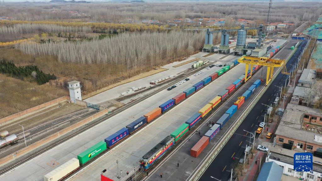3月16日,在平谷地方鐵路馬坊站,京平綜合物流樞紐中歐班列(北京-莫斯科)??吭谡九_(無(wú)人機照片)。