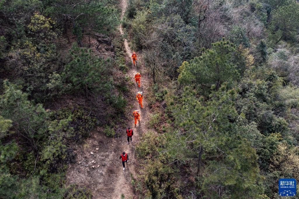 3月16日,道場(chǎng)鄉綜合森林火災應急救援隊隊員和黨員志愿者一同巡查轄區林區森林火災隱患(無(wú)人機照片)。