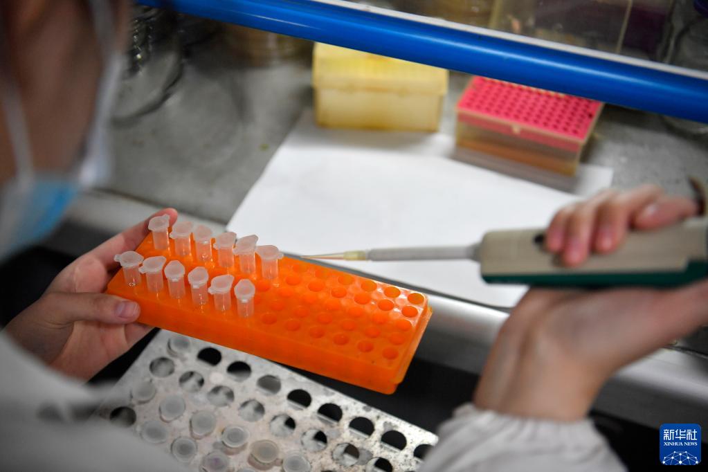 3月16日,在位于天津市濱海新區現代農業(yè)產(chǎn)業(yè)園的天津立達海水資源開(kāi)發(fā)有限公司實(shí)驗室,工作人員對育苗車(chē)間的水質(zhì)樣本進(jìn)行檢測。