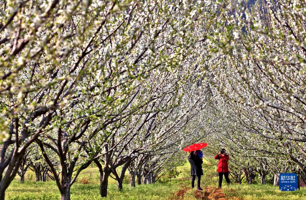 3月16日,游人在江西省吉安市永豐縣繞城公路旁的櫻樹(shù)林中游玩。
