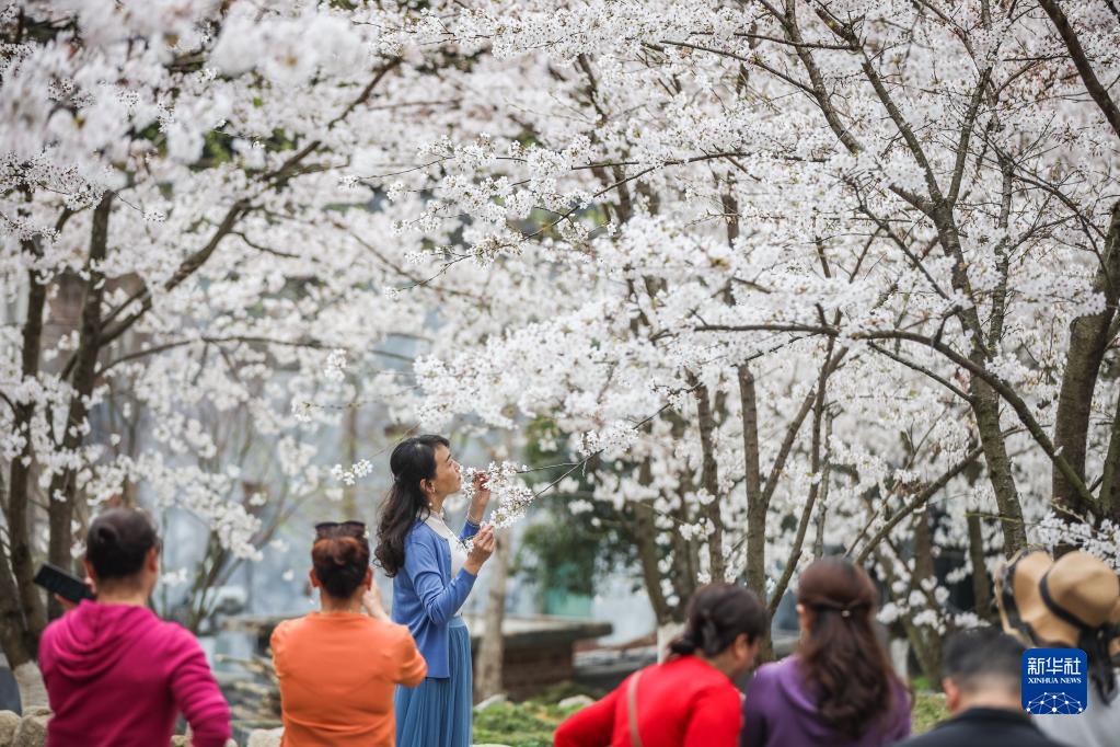 3月15日,游客在湖南省永州市藍山縣湘江源瑤族鄉坪源村藍山谷景區賞花拍照。