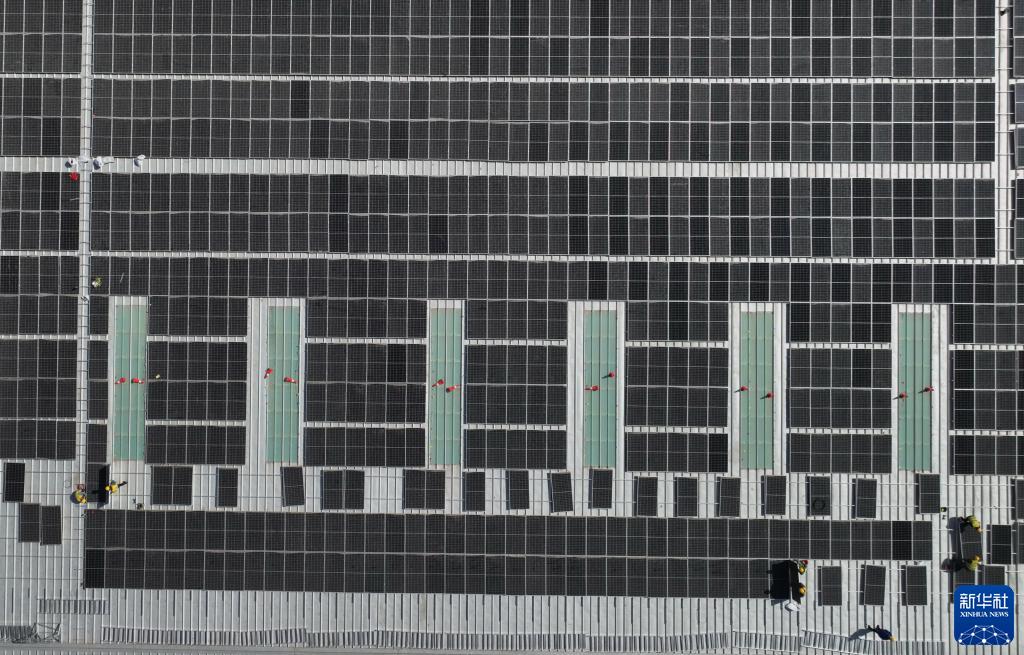 3月16日,工人在唐山市蘆臺經(jīng)濟開(kāi)發(fā)區一家企業(yè)廠(chǎng)房屋頂上安裝太陽(yáng)能光伏發(fā)電板(無(wú)人機照片)。