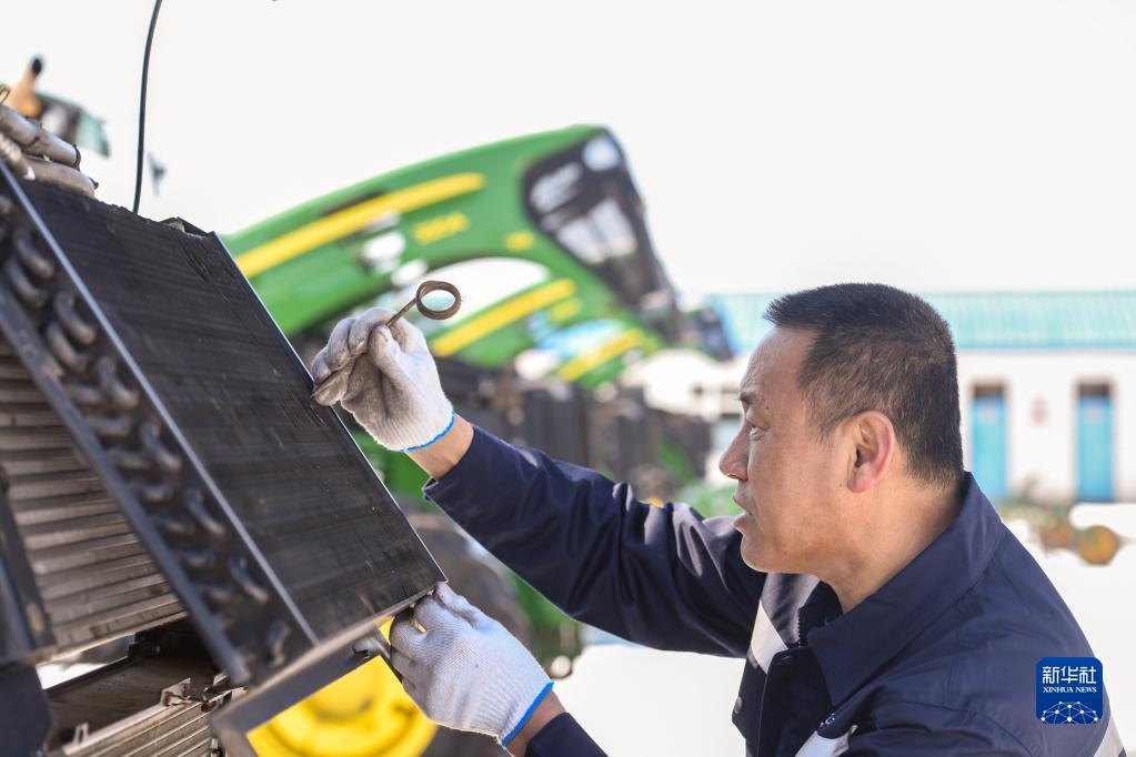 3月16日,在北大荒集團建設農場(chǎng)有限公司第四管理區,農機技術(shù)員在檢修農機具。