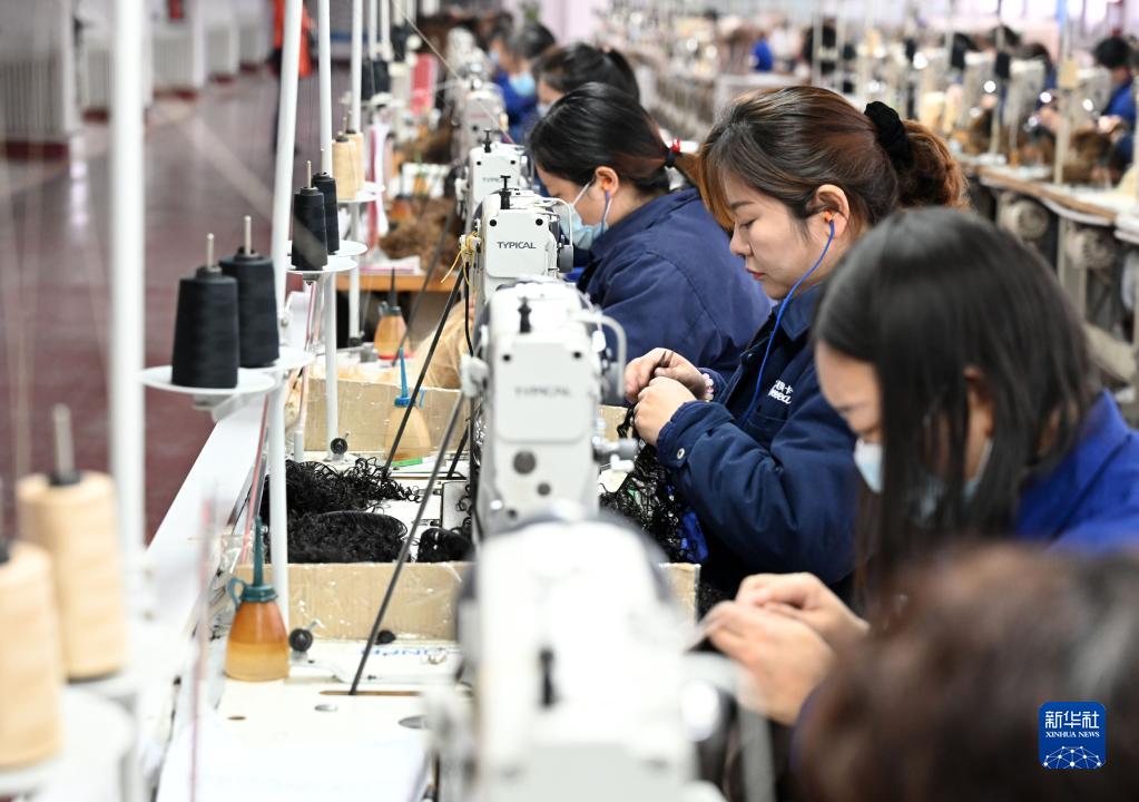 3月16日,工作人員在河南瑞貝卡發(fā)制品股份有限公司的生產(chǎn)車(chē)間里制作假發(fā)。