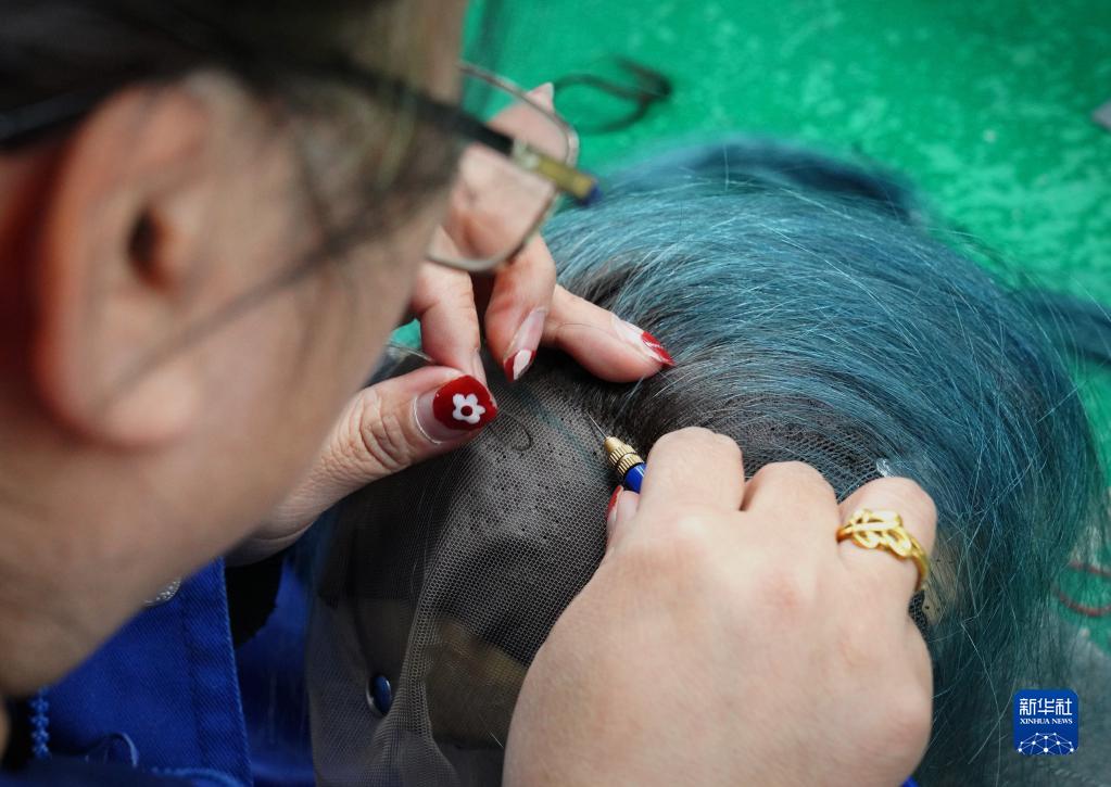 3月16日,工作人員在河南瑞貝卡發(fā)制品股份有限公司的生產(chǎn)車(chē)間里制作假發(fā)。