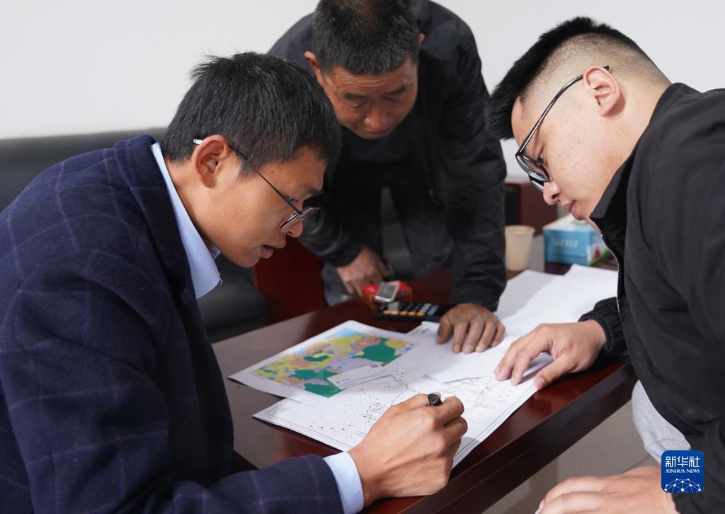 3月17日,張必超(左)在辦公室內與設計單位工作人員溝通現代化農事服務(wù)中心工程事宜。