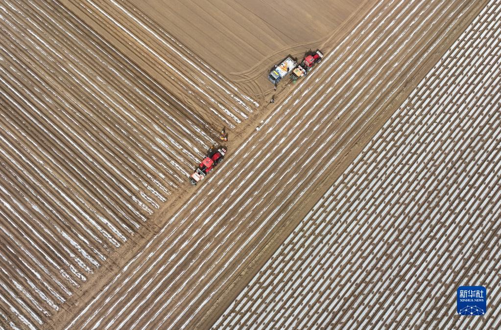 3月17日,灤南縣胡各莊鎮東梁各莊村的農民在田間使用農機播種馬鈴薯(無(wú)人機照片)。