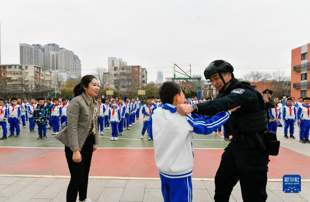 3月17日,在天津市實(shí)驗小學(xué),天津市公安局和平分局特(巡)警支隊民警現場(chǎng)指導小學(xué)生學(xué)習自我防護技能。