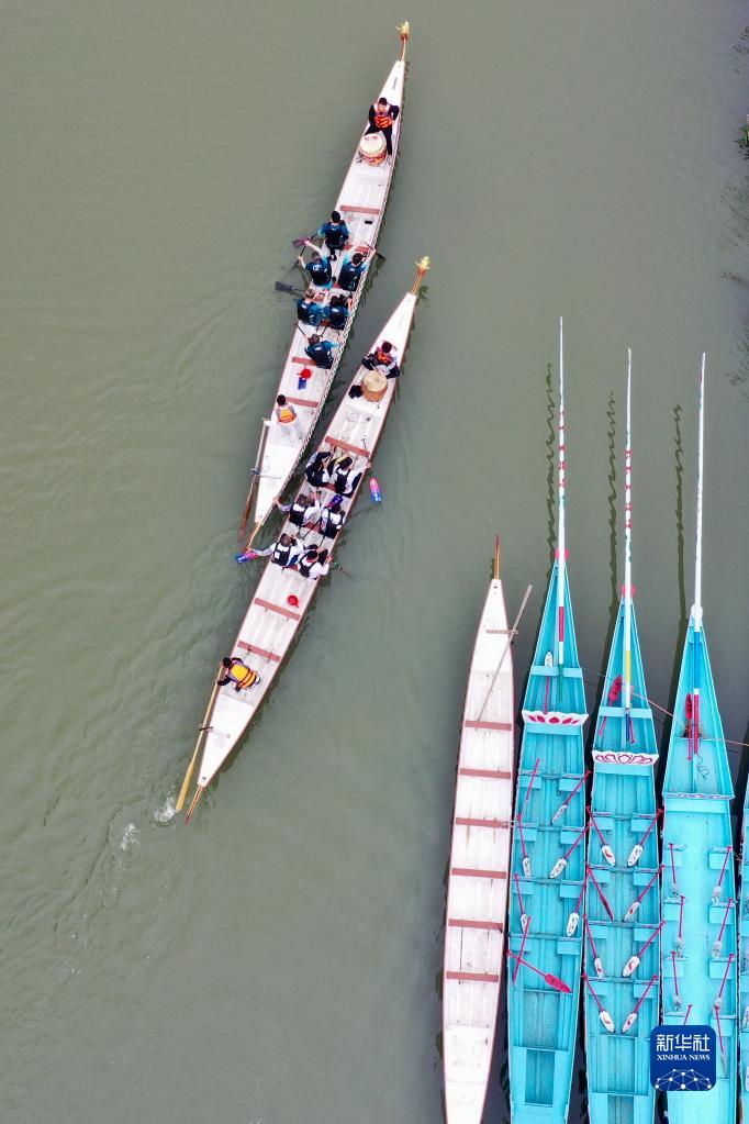 3月18日,福州流花溪上參賽龍舟隊駛過(guò)終點(diǎn)(無(wú)人機照片)。