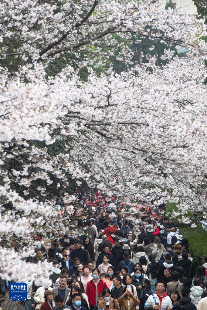 當日,武漢大學(xué)舉行抗疫醫護賞櫻專(zhuān)場(chǎng)。珞珈山下,來(lái)自全國各地的1.6萬(wàn)余名抗疫醫護人員及家屬赴約賞櫻。