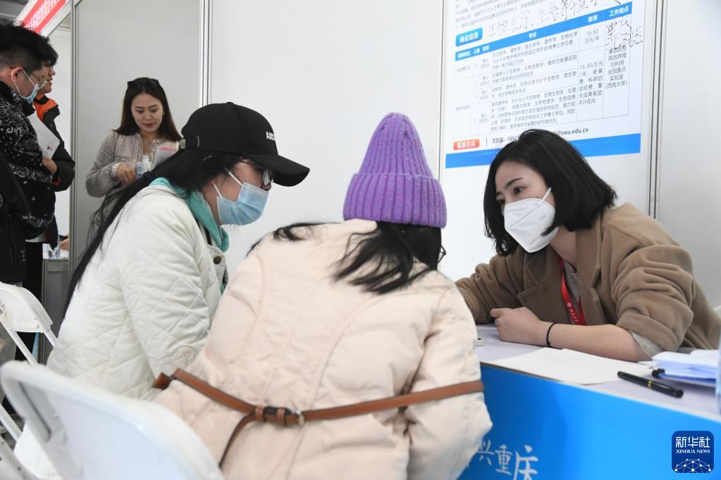 3月18日,在北京大學(xué)2023屆畢業(yè)生春季就業(yè)洽談會(huì )現場(chǎng),用人單位的工作人員(右一)向畢業(yè)生介紹崗位信息。