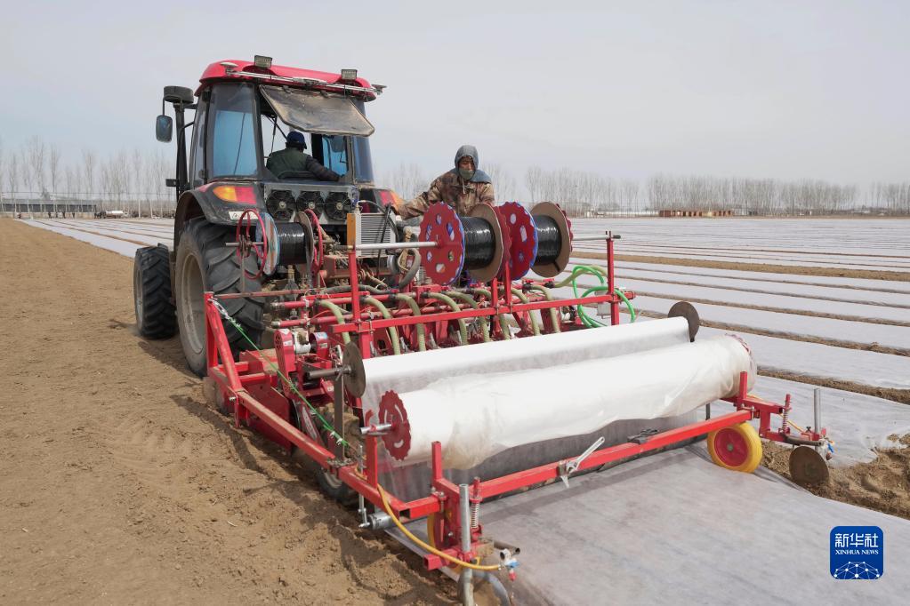 3月18日,唐山市曹妃甸區第六農場(chǎng)一家農業(yè)合作社的社員在使用機械設備播種。