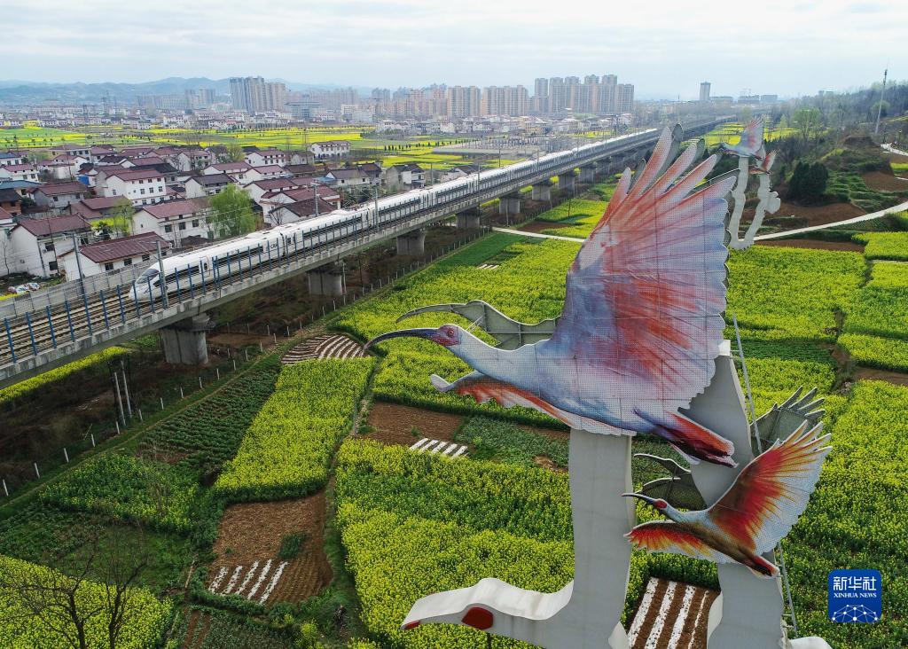 一輛高鐵駛過(guò)漢中市洋縣洋州街道油菜花海的朱鹮雕塑(無(wú)人機照片,3月17日攝)。洋縣被譽(yù)為“朱鹮之鄉”。