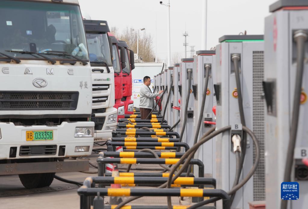 3月18日,唐山市曹妃甸區的一家運輸企業(yè)的駕駛員將電動(dòng)重卡停在唐海鎮充電站給重卡充電。