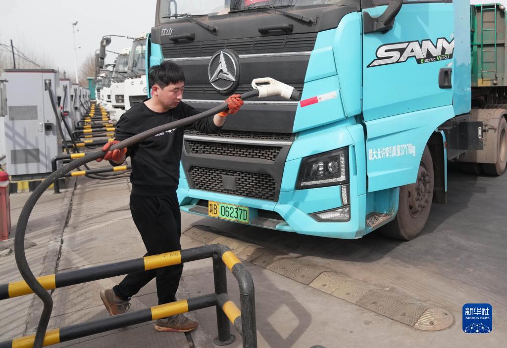 3月18日,唐山市曹妃甸區的一家運輸企業(yè)的駕駛員將電動(dòng)重卡停在唐海鎮充電站準備給重卡充電。