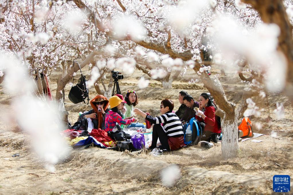 3月17日,游客在新疆吐魯番市托克遜縣夏鎮南湖村的杏林中游玩(無(wú)人機照片)。