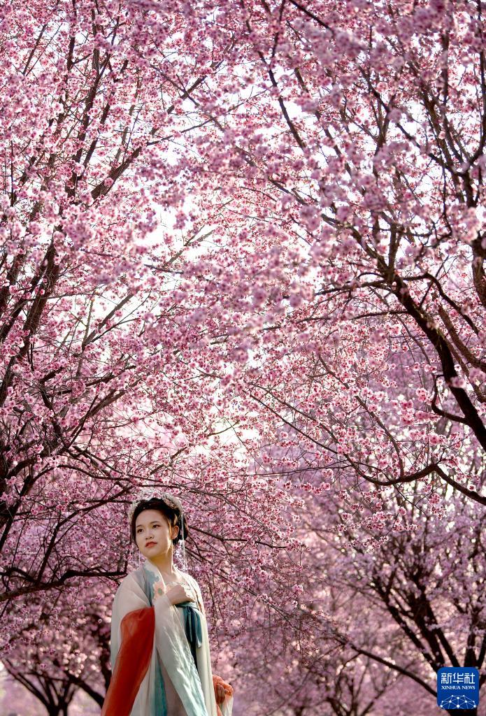 3月14日,古風(fēng)愛(ài)好者在西安大明宮國家遺址公園內賞花留影。