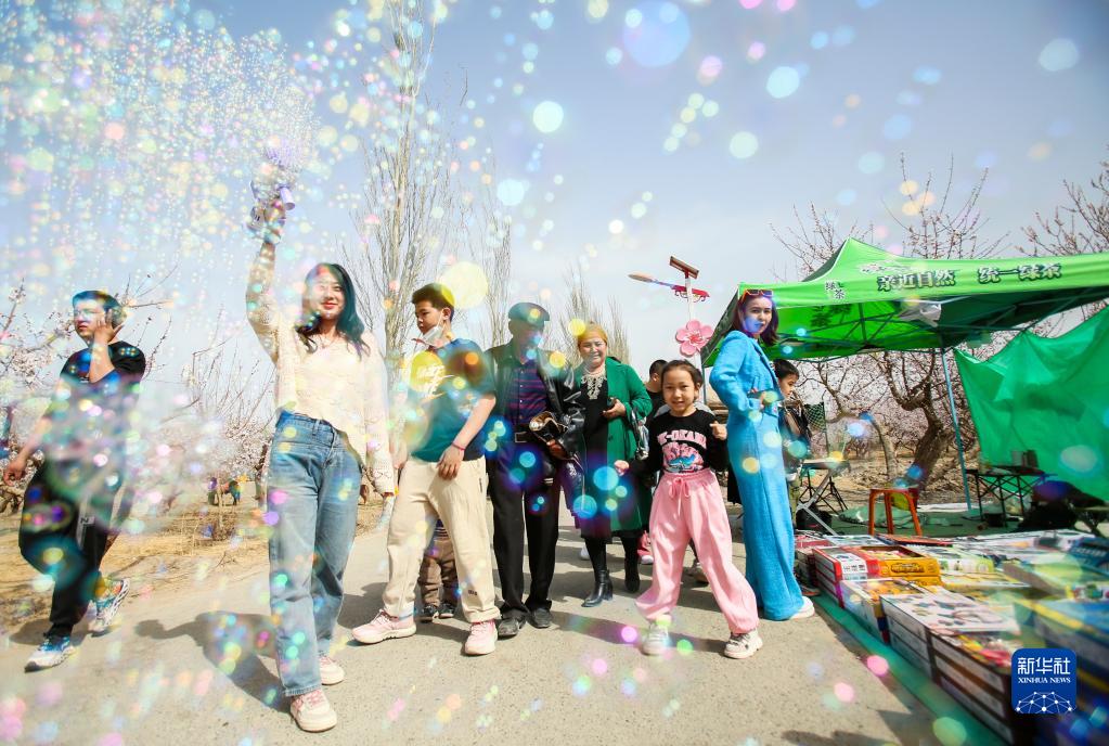 3月18日,人們在吐魯番杏花節現場(chǎng)嬉戲游玩。