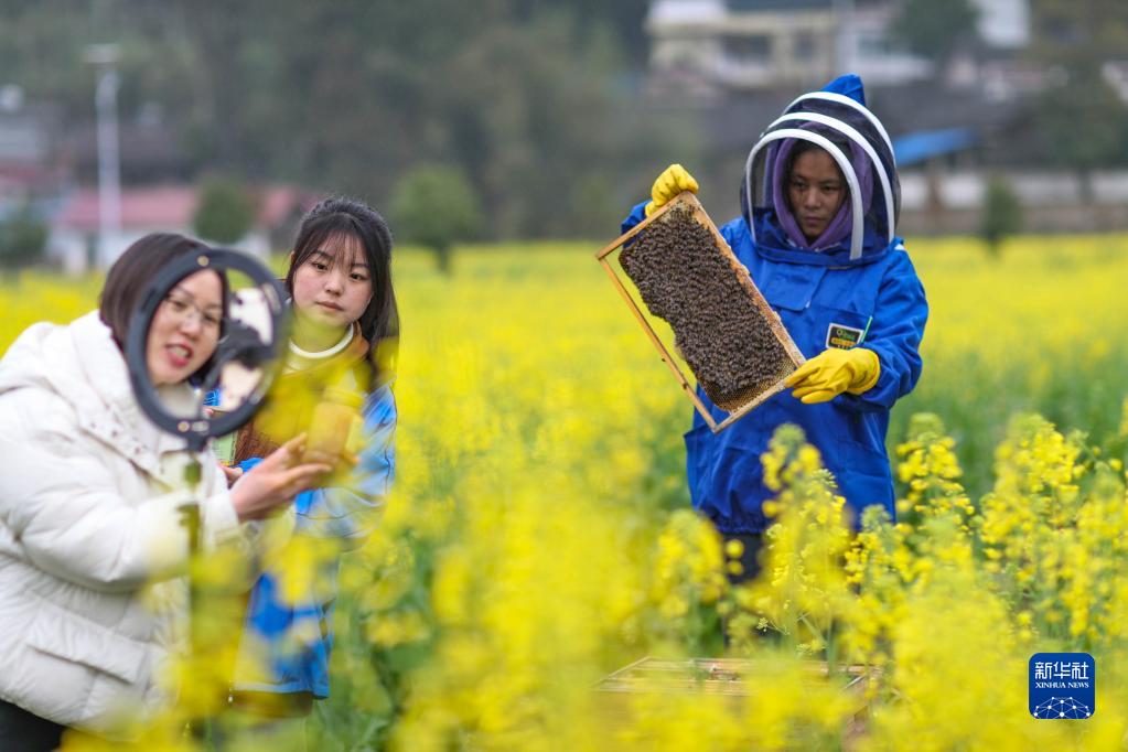 3月18日,岑鞏縣中等職業(yè)技術(shù)學(xué)校電子商務(wù)專(zhuān)業(yè)的學(xué)生在油菜花地里學(xué)習直播銷(xiāo)售蜂蜜。