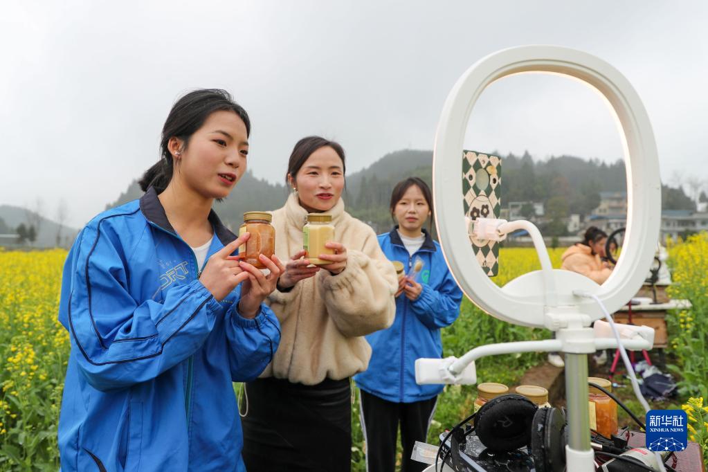 3月18日,岑鞏縣中等職業(yè)技術(shù)學(xué)校電子商務(wù)專(zhuān)業(yè)的學(xué)生在油菜花地里學(xué)習直播銷(xiāo)售蜂蜜。