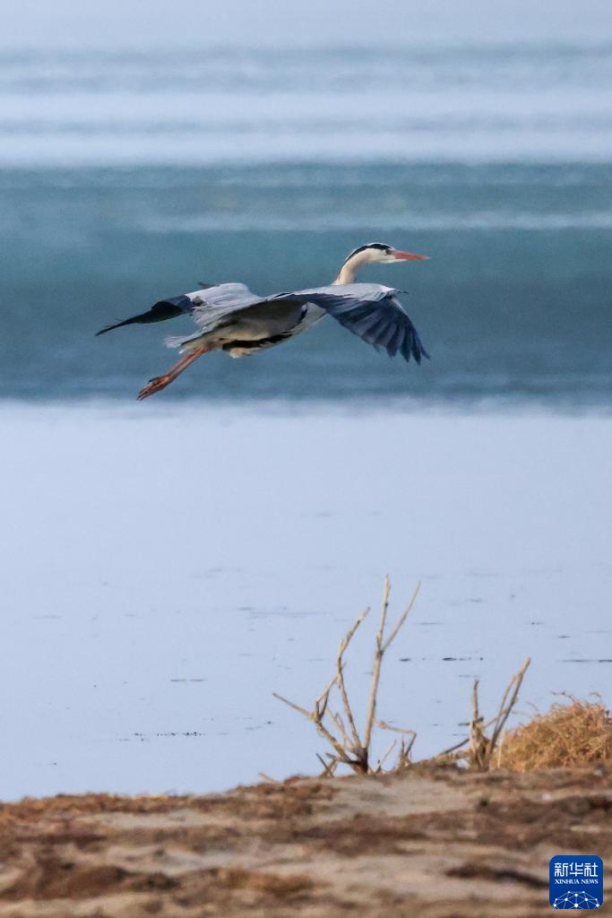 一只蒼鷺在新疆博斯騰湖覓食(3月18日攝)。