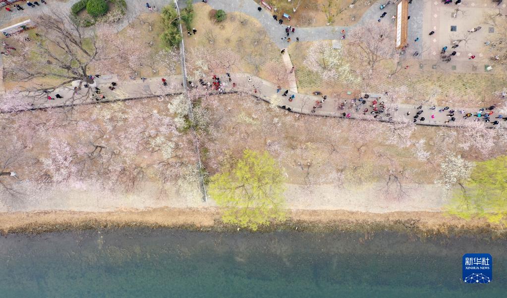 這是3月19日拍攝的天津市紅橋區北運河畔桃花堤一景(無(wú)人機照片)。