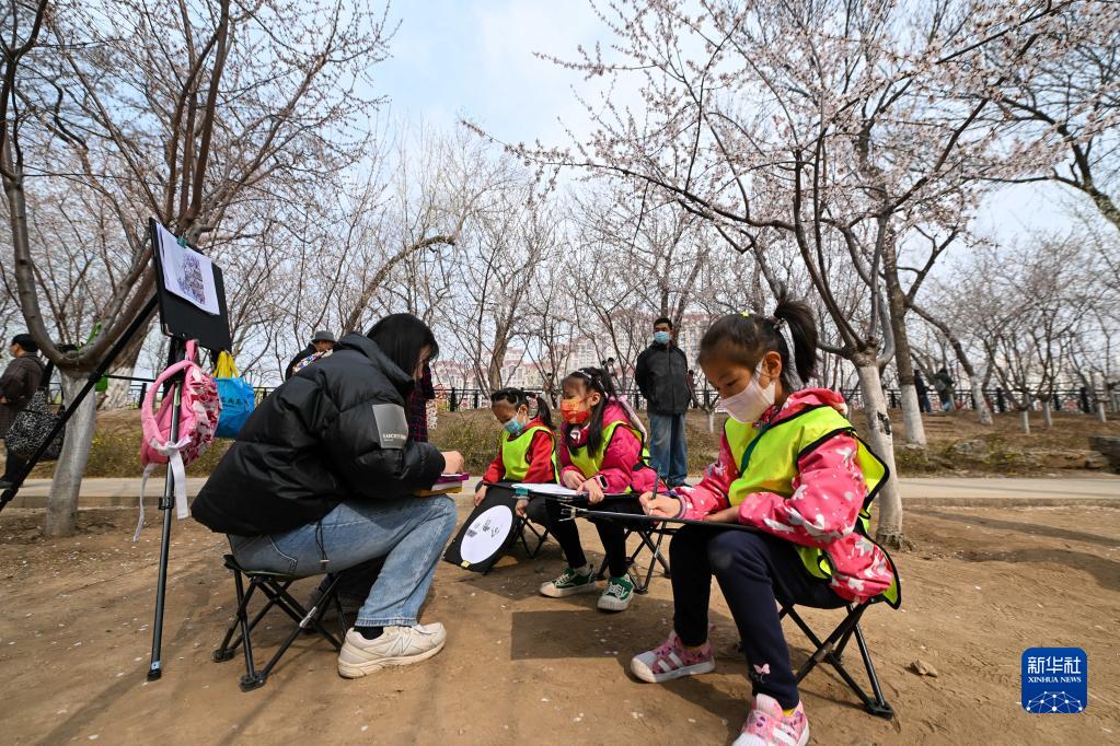 3月19日,小朋友們在天津市紅橋區北運河畔的桃花堤上學(xué)習畫(huà)桃花。