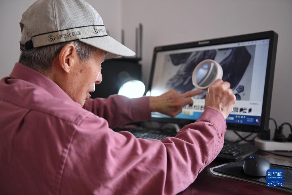 3月7日,吳熙純在位于四川成都的家中觀(guān)察分析海綿化石圖片。