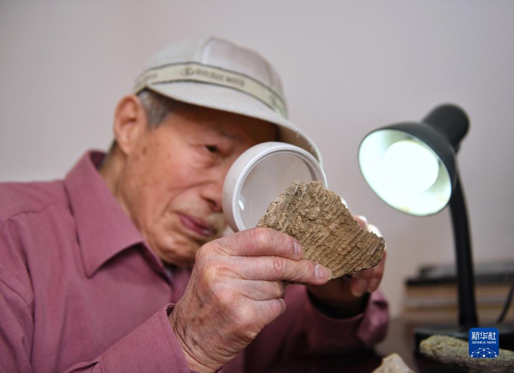 3月7日,吳熙純在位于四川成都的家中觀(guān)察一塊三疊紀硅質(zhì)海綿化石殘片。