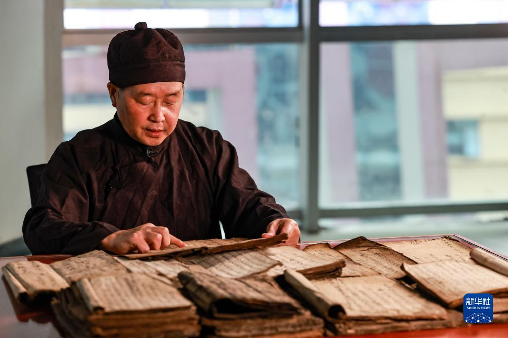 3月8日,水書(shū)先生姚覃軍在閱讀水書(shū)文獻。