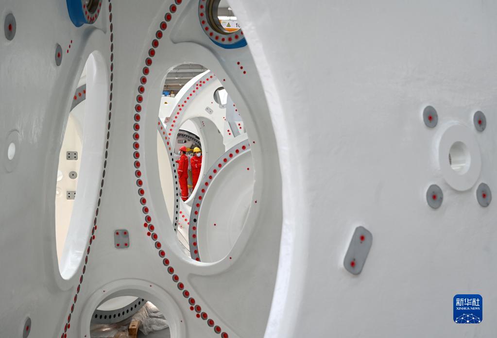 3月19日,工人在風(fēng)電車(chē)間裝配機艙。