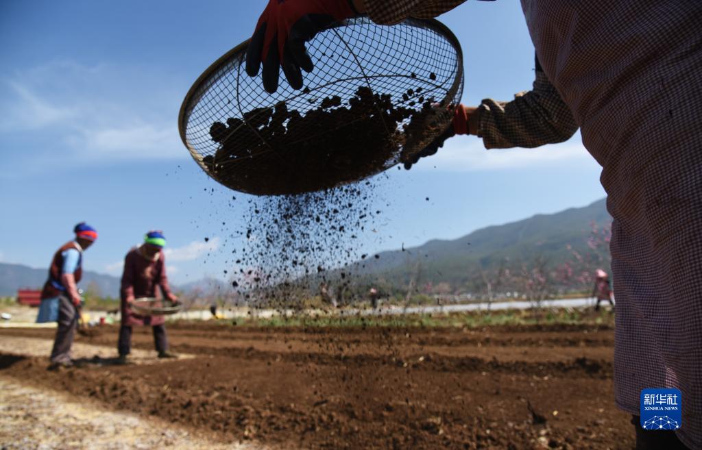 3月19日,在云南省麗江市金山街道東元社區的農田里,農民在開(kāi)展水稻育秧工作。