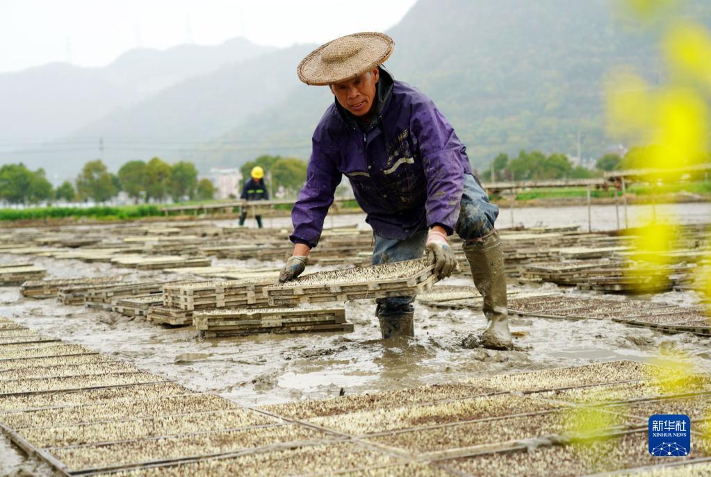 3月19日,浙江省樂(lè )清市石帆街道一水稻專(zhuān)業(yè)合作社的工人在擺放秧盤(pán)。