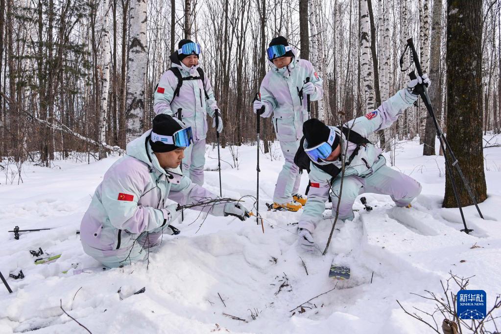 2023年2月7日,松江河森林公安分局雪上巡邏案件偵查大隊許重陽(yáng)(前左)與孫希剛(前右)在清除獸夾。
