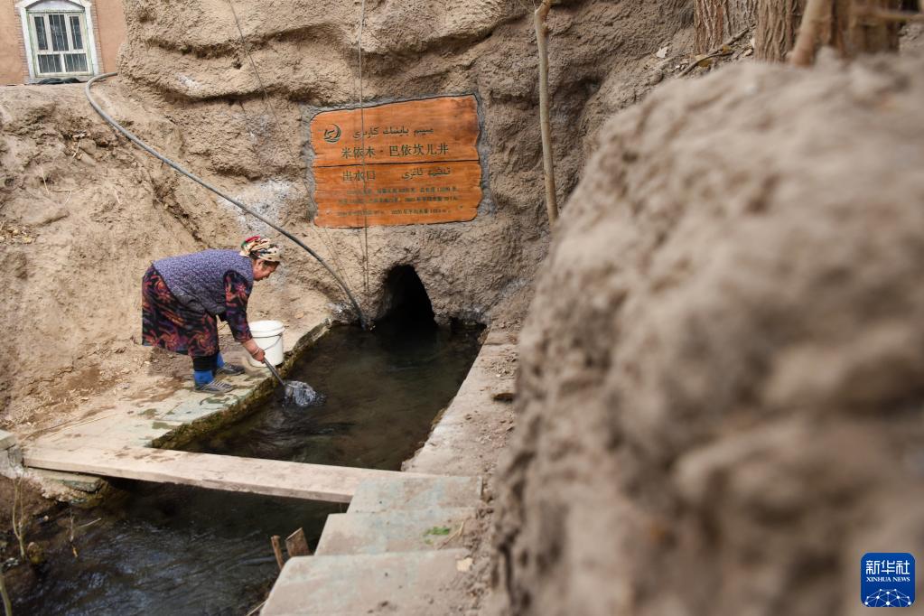 在新疆吐魯番市高昌區亞爾鎮,居民在一處坎兒井出水口取水(3月7日攝)。