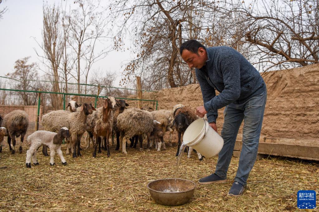 在新疆吐魯番市高昌區亞爾鎮,村民取坎兒井的水喂羊(3月7日攝)。