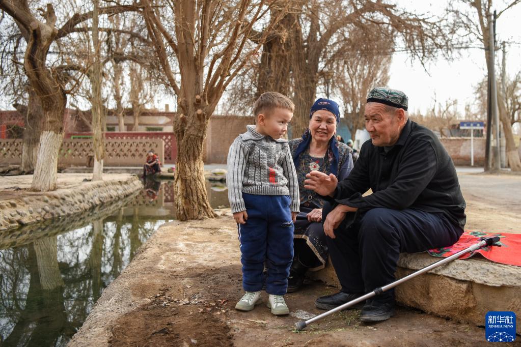 在新疆吐魯番市高昌區恰特喀勒鄉拜什巴拉坎兒孜村,73歲的老人斯肯旦·卡德?tīng)枺ㄓ遥┙o孫子講述著(zhù)自己小時(shí)候修坎兒井的故事(3月7日攝)。