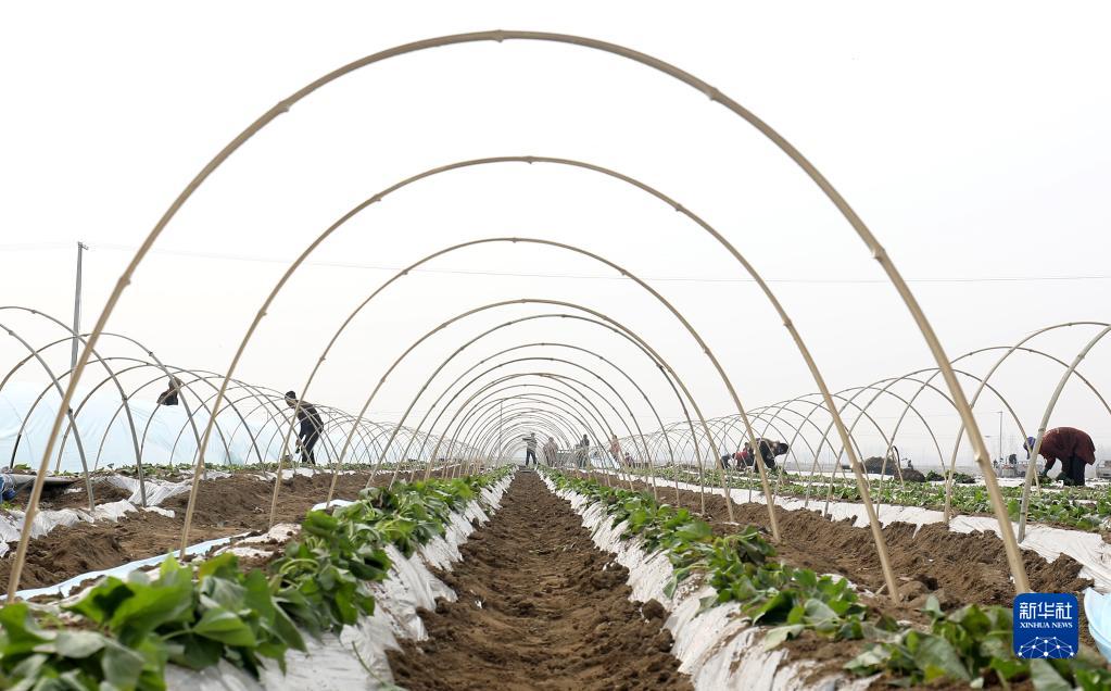 3月20日,在河北省石家莊市行唐縣南橋鎮東安太莊村紅薯種植基地,農戶(hù)在進(jìn)行搭棚覆膜作業(yè)。