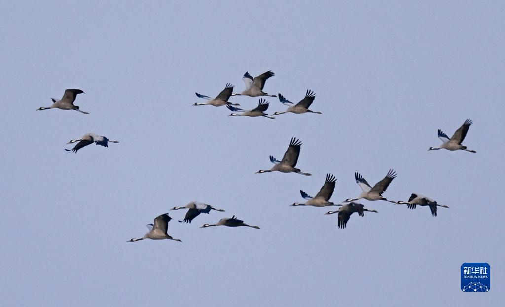 3月20日,在內蒙古自治區呼和浩特市托克托縣黃河沿岸,黑頸鶴在空中飛翔。