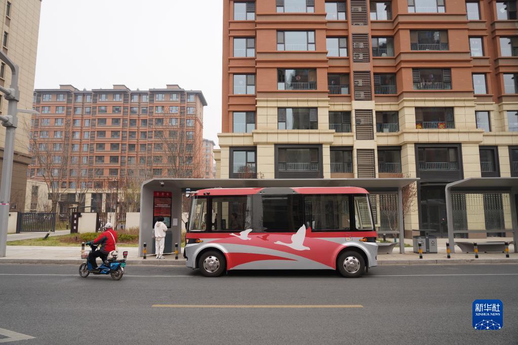 3月20日,智能網(wǎng)聯(lián)巴士901線(xiàn)測試車(chē)在河北雄安新區容東片區道路上???。