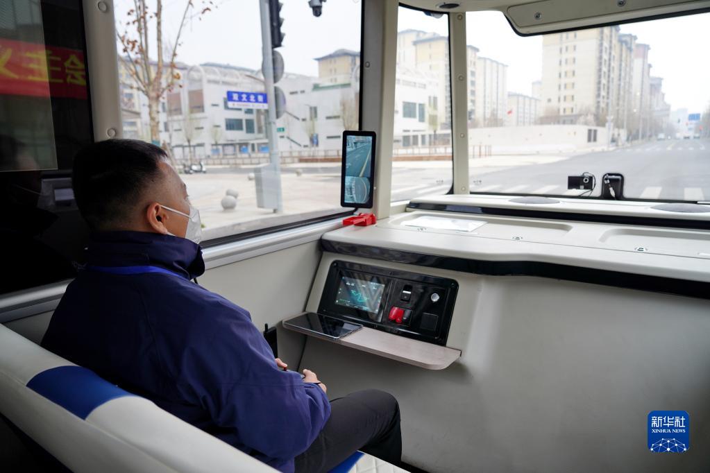 3月20日,智能網(wǎng)聯(lián)巴士901線(xiàn)測試車(chē)的安全員在監控車(chē)輛行駛情況。