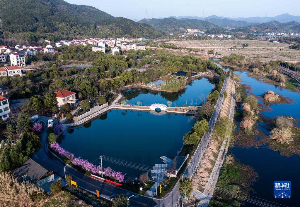 空中俯瞰浙江省金華市金東區嶺下鎮八仙溪及周邊村莊(3月14日攝,無(wú)人機照片)。近年來(lái),嶺下鎮先后關(guān)停沿岸多家制砂企業(yè)及養殖場(chǎng),清理河道垃圾2200多噸,完成28個(gè)村農村生活污水處理工程和51口池塘清淤,2018年以來(lái)八仙溪水質(zhì)常年保持在Ⅱ類(lèi)以上。